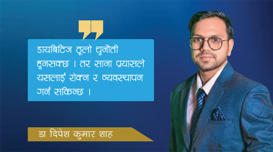 -तनाव व्यवस्थापन र समयमै स्वास्थ्य परीक्षण गर्नु, तनाव कम गर्नु: लामो समयसम्म तनावमा रहनुले रगतमा चिनीको स्तर बढाउन सक्छ। ध्यान, योग, गहिरो सासका अभ्यास र शान्ति दिने गतिविधिहरू अपनाउनुहोस्।