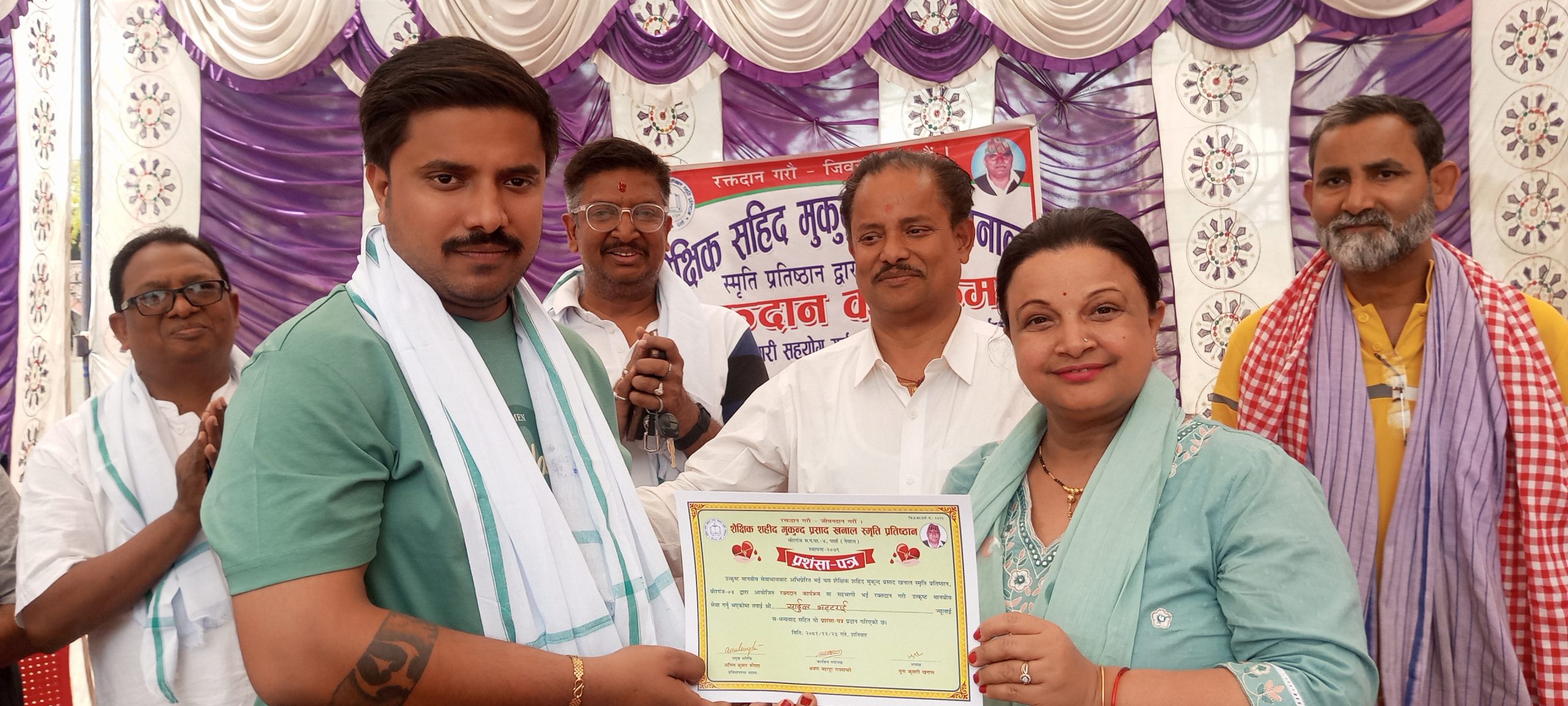 शैक्षिक सहिद मुकुन्द प्रसाद खनाल स्मृति प्रतिष्ठान द्वारा बृहत खुल्ला रक्तदान कार्यक्रम सम्पन्न भएको छ। उक्त कार्यक्रममा प्रमुख अतिथी संविधान सभा सदस्य अनिल रुङटाको आतिथ्यमा एवं विशिष्ट अतिथी वडा प्रहरी कार्यालय बिर्ताका प्रमुख निरोज चौलागाईं,जिल्ला ट्राफिक पर्साका प्रमुख लोकराज भट्ट, बिरगंज युवा समाजका अध्यक्ष कमल चौलागाईं,पब्सन पर्साका अध्यक्ष सरोज चौधरी,नेपाल रेडक्रस सोसाइटी पर्सा जिल्ला शाखाका बृज किशोर पटेल,गिता मन्दीर सन्चालक समितिका अध्यक्ष मदन गुप्ता,मनोज गुप्ता,डा.लक्ष्मि थापा एवम् यस प्रतिष्ठानको अध्यक्ष मुना खनालको अध्यक्षमा सम्पन्न भएको छ ।