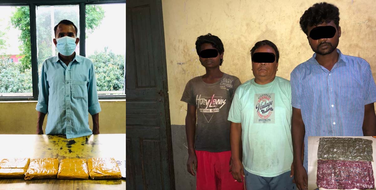 वीरगंज, २७ चैत । जिल्ला प्रहरी कार्यालय पर्साले लागूऔषध गाँजा र चरेससहित चारजनालाई पक्राउ गरेको छ । चैत २६ गते वीरगंज महानगरपालिका–१६ शंकराचार्य गेटबाट नेपालबाट भारत जाँदै गरेका तीन जनालाई ५ के.जी.७५० ग्राम लागूऔषध गाँजासहित पक्राउ गरिएको जिप्रका, पर्साले जनाएको छ । पर्सागढी नगरपालिका वडा नं.३ झबराहा बस्ने वर्ष २९ को पंचलाल माझीले आफ्नो शरीरमा टेपले बेरी लुकाइ छिपाइ राखिएको लागु औषध गाँजा २ के.जी.८७५ ग्राम र सोही ठाउँ बस्ने वर्ष २१ को मुकेश माझीले लगाएको सर्टमुनी शरीरमा सेतो रंगको टेपले बेरी लुकाइ छिपाइ राखिएको २ के.जी.८७५ ग्राम गाँजा बरामद भएको र उनीहरुसंगै रहेका जिल्ला पर्सा पर्सागढी नगरपालिका वडा नं.३ झबराहा बस्ने वर्ष ४४ को सुनिल बम्जनलाई पनि पक्राउ गरिएको जिप्रका, पर्साले जनाएको छ । यसैगरी चैत २६ गते प्रहरी चौकी ईनर्वाले भारत बिहार जिल्ला मोतिहारी थाना सुगौली ग्राम छपरा वडा नं.७ बस्ने वर्ष ४५ को बिकाश साह कानुलाई दुई किलो चरेससहित पक्राउ गरेको प्रहरीले जनाएको छ । कानूले शरीरभित्र टेपले बेरी लुकाइ छिपाइ राखिएको ४ प्याकेटमा २ के.जी. चरेस बरामद भएको जिप्रका, पर्साले जनाएको छ । पर्सा जिल्ला अदालतबाट सात दिनको म्याद लिइ थप अनुसन्धान कार्य भइरहेको प्रहरीले जनाएको छ । पक्राउ परेका चारैजनालाई पर्सा जिल्ला अदालतबाट सात दिनको म्याद लिइ थप अनुसन्धान कार्य भइरहेको प्रहरीले जनाएको छ ।