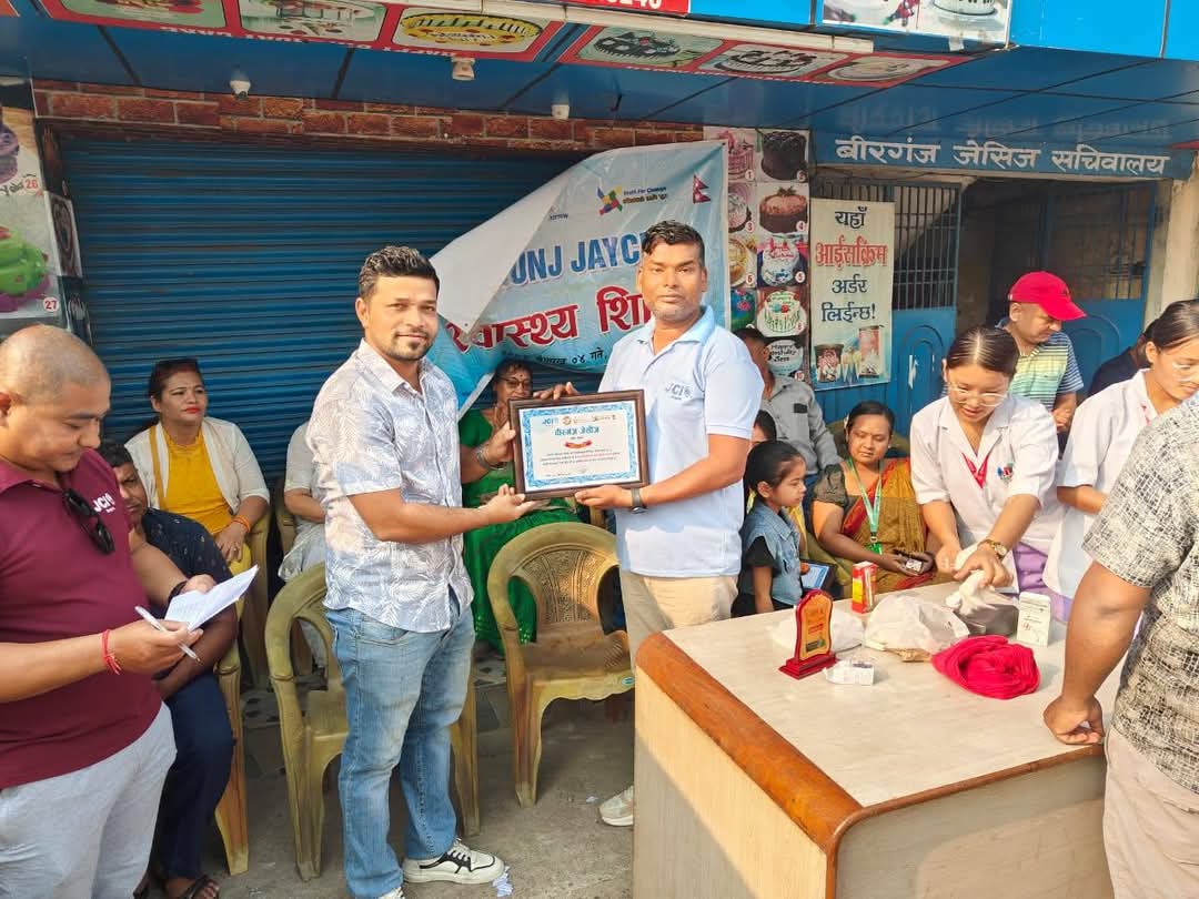 वीरगञ्ज जेसिजले सप्ताहव्यापी कार्यक्रम २०२५ अन्तर्गत बिहीबार वीरगञ्जमा आयोजना गरेको निःशुल्क स्वास्थ्य शिविरबाट १७५ जना नागरिकले लाभ लिएका छन्।वीरगञ्ज जेसिजको सचिवालय अगाडि आयोजित सो स्वास्थ्य शिविरमा सहभागीहरुको रक्तचाप तथा मधुमेह (सुगर) रोगको निःशुल्क परीक्षण गरिएको थियो। शिविरमा एभरग्रिन नर्सिङ कलेज र नेपाल फर्मास्युटिकल्स एशोसियनले प्राविधिक सहयोग गरेका थिए।
