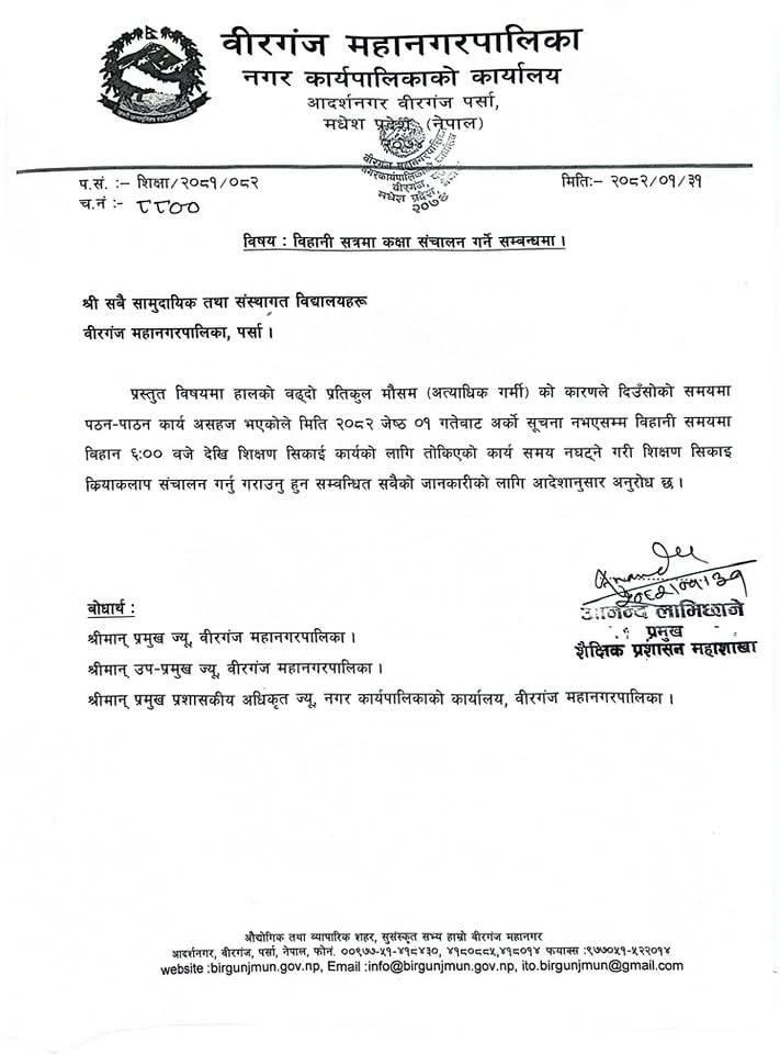 अत्यधिक गर्मीका कारण पठनपाठनमा कठिनाइ भईरहेको भन्दै वीरगंज महानगरपालिकाले विद्यालयको समय परिवर्तन गरेको छ। अबदेखि वीरगंज महानगर क्षेत्रभित्रका सबै सामुदायिक तथा संस्थागत विद्यालयहरू बिहान ६ बजेबाट शिक्षण सिकाइ कार्य सञ्चालन गर्नुपर्नेछ।