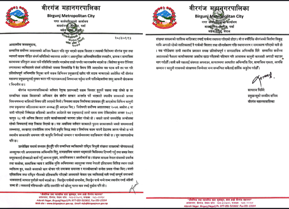 वीरगंजको मुख्य सडक विस्तार कार्यलाई लिएर “वीरगंज युवा तथा व्यापारी सडक पीडित संघर्ष समिति” को नाममा भइरहेको प्रदर्शनका क्रममा