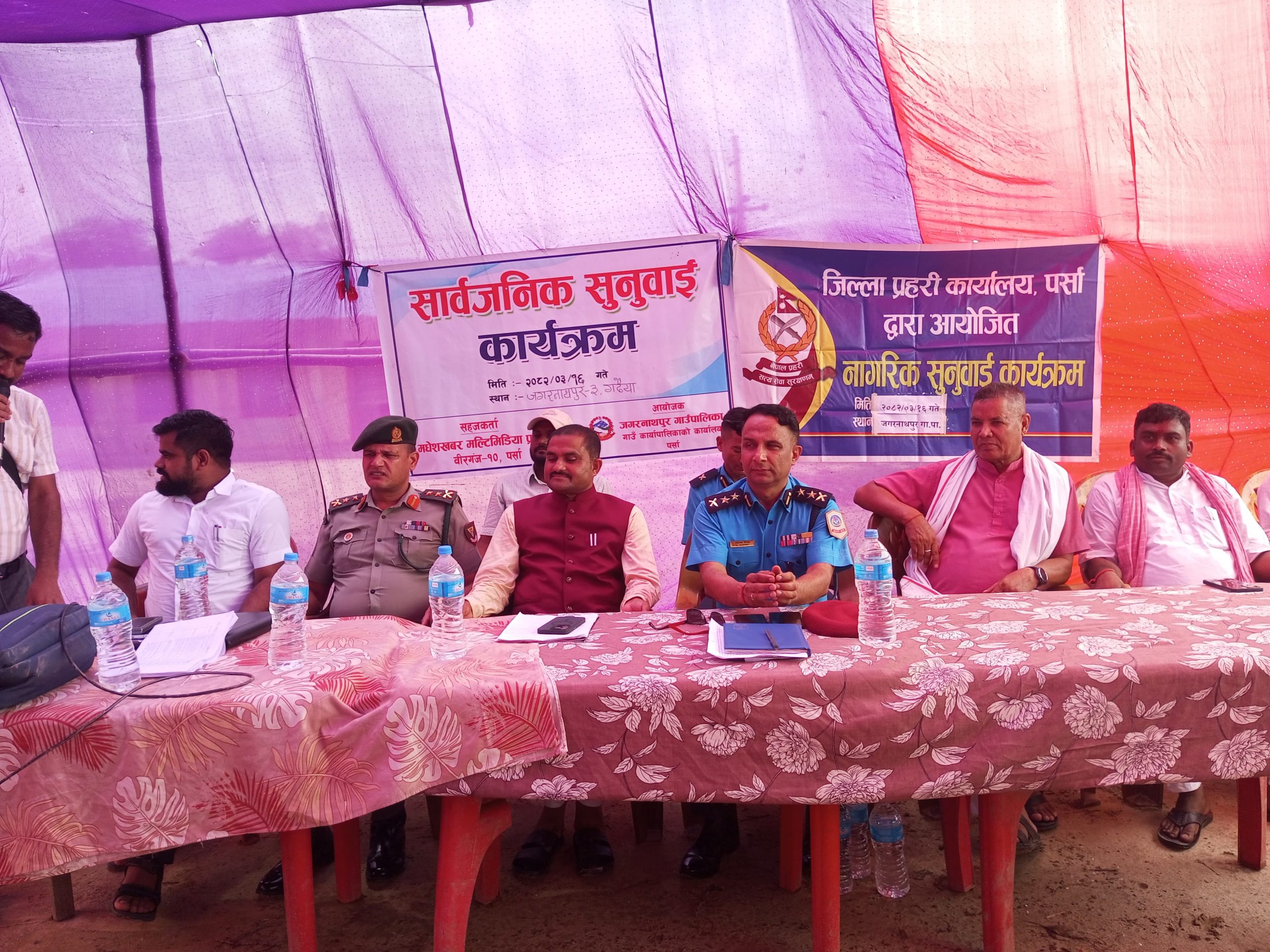 जगरनाथपुर गाउँपालिका, पर्सामा सार्वजनिक सुनुवाई कार्यक्रम भव्य रूपमा सम्पन्न भएको छ। स्थानीय सरकार र सुरक्षा निकायबीच समन्वय गर्दै स्थानीय नागरिकका गुनासा, सुझाव तथा जिज्ञासालाई प्रत्यक्ष रुपमा सम्बोधन गर्ने उद्देश्यले कार्यक्रम आयोजना गरिएको हो।