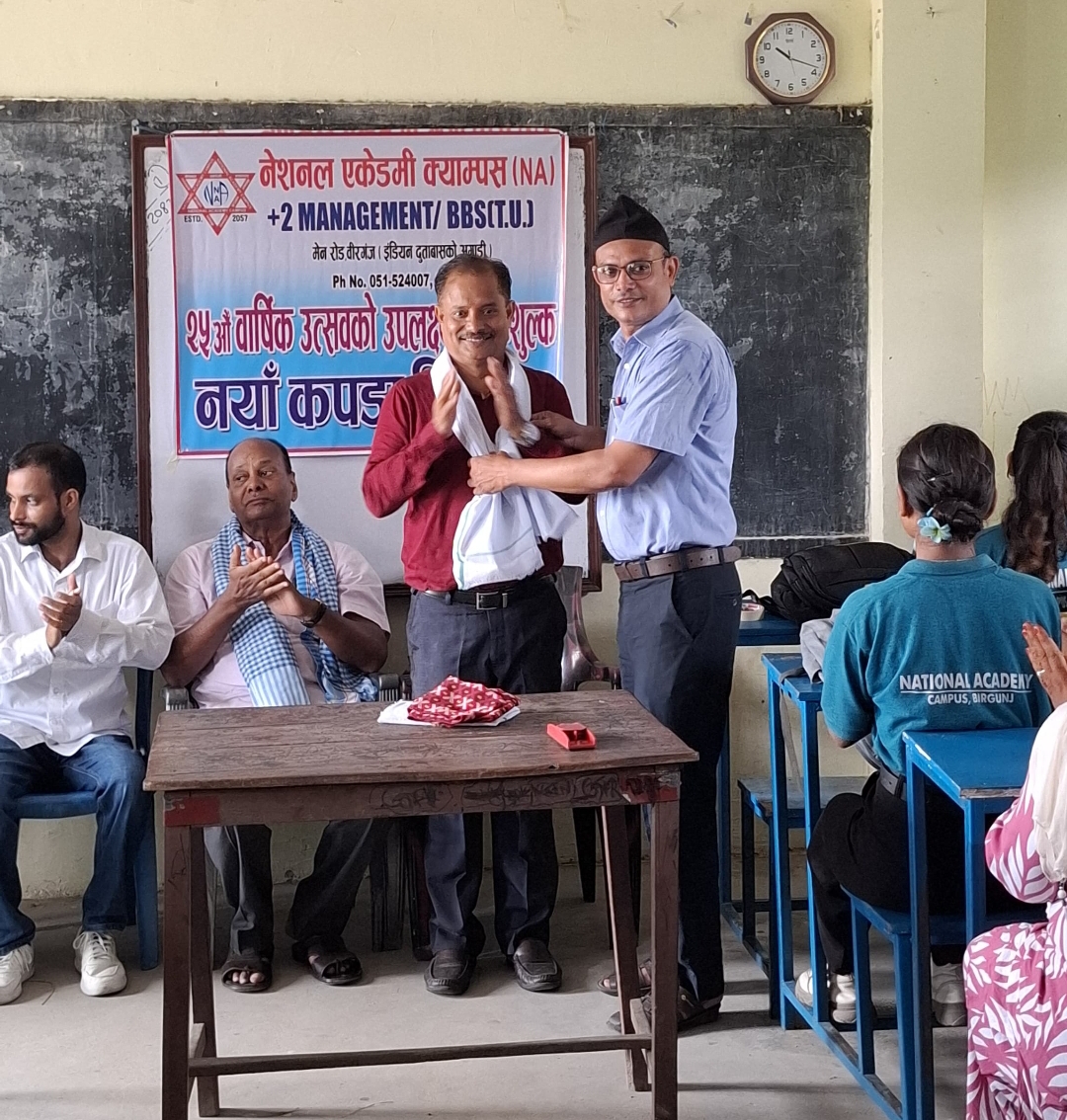 वीरगञ्ज मेनरोड, भारतीय दूतावास अगाडि अवस्थित नेसनल एकेडेमी क्याम्पसका प्रमुख केदार प्रसाद साहको नेतृत्वमा तथा वरिष्ठ समाजसेवी अधिवक्ता प्रकाश कुमार उपाध्यायको विशेष सहभागितामा उक्त कार्यक्रम सम्पन्न भएको हो।