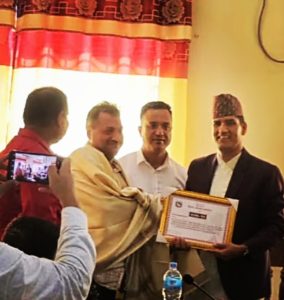 सिडिओ गणेश अर्यालद्वारा सामुदायिक प्रहरी अध्यक्ष जय प्रकाश खेतान सम्मानित