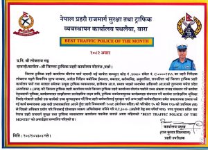जिल्ला ट्राफिक प्रहरी कार्यालय वीरगंज, पर्साका प्रहरी निरीक्षक लोकराज भट्टले आफ्नो नेतृत्वमा प्राप्त उल्लेखनीय उपलब्धिका कारण नेपाल प्रहरी राजमार्ग सुरक्षा तथा ट्राफिक व्यवस्थापन कार्यालय पथलैया, बाराद्वारा असार महिनाको उत्कृष्ट ट्राफिक प्रहरी’पोलिस अफ द मन्थ’ उपाधि प्राप्त गरेका छन्।