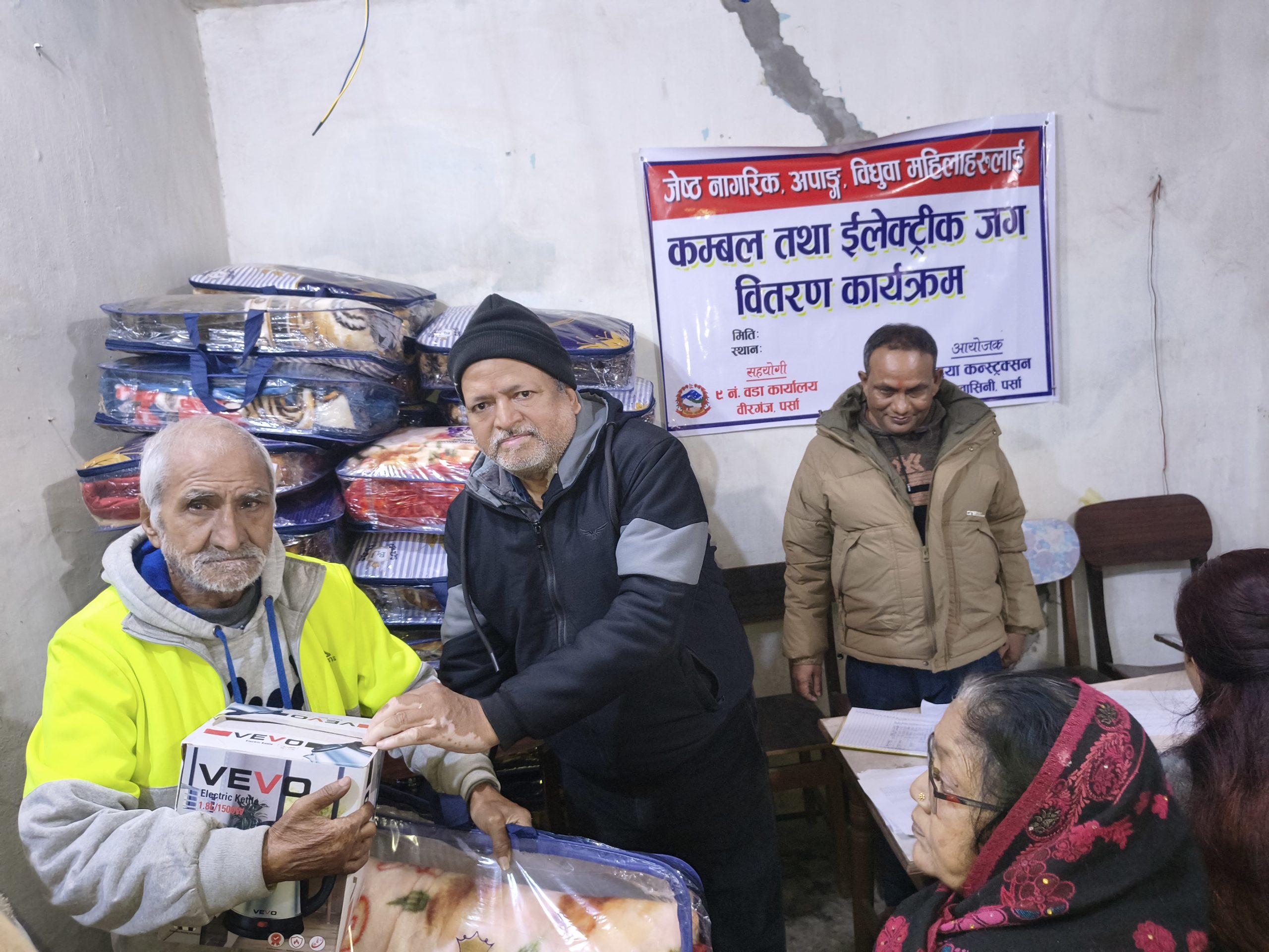 जेष्ठ नागरिक, अपाङ्ग तथा विधुवा महिलाहरूलाई लक्षित गरी कम्बल तथा इलेक्ट्रिक जग वितरण कार्यक्रम सम्पन्न भएको छ। वीरगञ्ज महानगरपालिका वडा नं. ९ को सहयोगमा अदया कन्स्ट्रक्सन, बिन्दवासिनी पर्साद्वारा आयोजित उक्त कार्यक्रम वडा नं. ९ का वडा अध्यक्ष जवाहर प्रसाद गुप्ताको नेतृत्व तथा अध्यक्षतामा सम्पन्न भएको हो।
