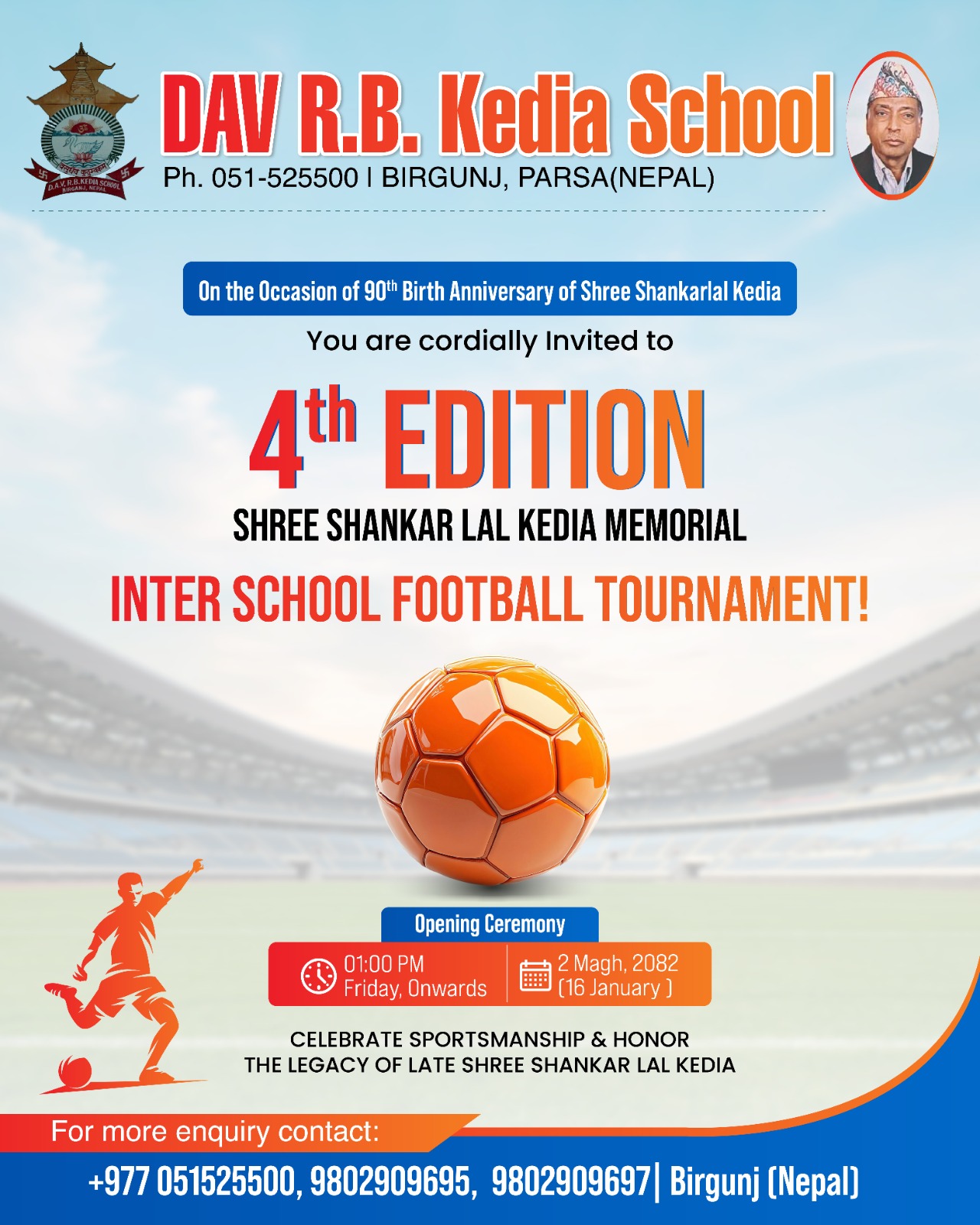डी.ए.भी. आर.बी. केडिया स्कूलमा शंकरलाल केडिया मेमोरियल अन्तर–विद्यालय फुटबल प्रतियोगिता २०२६ भव्य रूपमा उद्घाटन