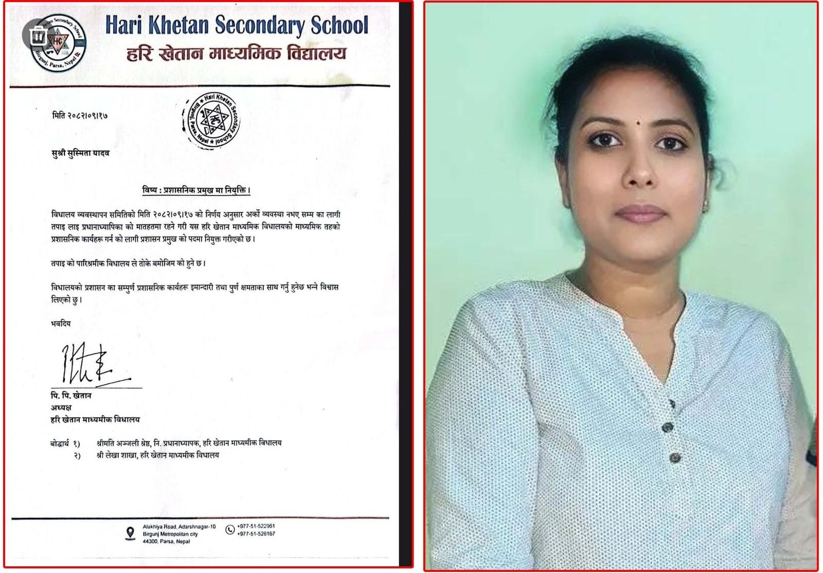 हरि खेतान बहुमुखी क्याम्पसअन्तर्गत सञ्चालित हरि खेतान माध्यमिक विद्यालयको विद्यालय व्यवस्थापन समितिको निर्णयअनुसार सुष्मिता यादवलाई प्रशासनिक प्रमुख पदमा नियुक्त