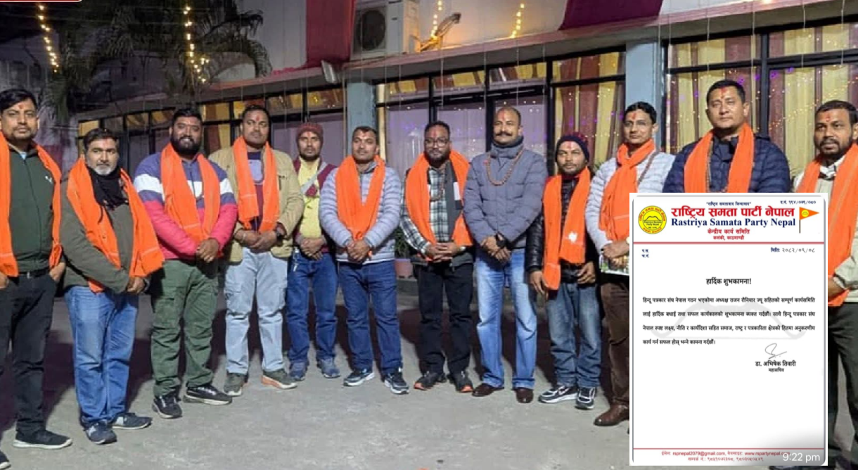 विरगन्ज राष्ट्रिय समता पार्टी नेपालले हालै गठन भएको हिन्दू पत्रकार संघ नेपाल तथा यसको नवनिर्वाचित कार्यसमितिलाई औपचारिक रूपमा बधाई