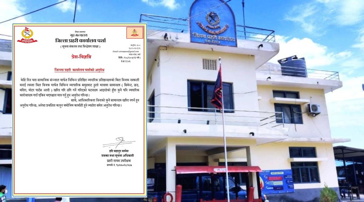 पछिल्ला दिनहरूमा सामाजिक सञ्जालमार्फत विभिन्न किसिमका ठगीका घटना तीव्र रूपमा बढ्दै गएपछि जिल्ला प्रहरी कार्यालय, पर्साले व्यापारीहरूलाई विशेष सतर्कता