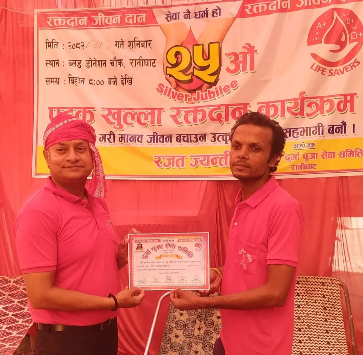दुर्गा पूजा सेवा समिति रानीघाटद्वारा २५ औँ पटक आयोजना गरिएको रक्तदान कार्यक्रम सफलतापूर्वक सम्पन्न भएको छ। कार्यक्रममा ३ महिला
