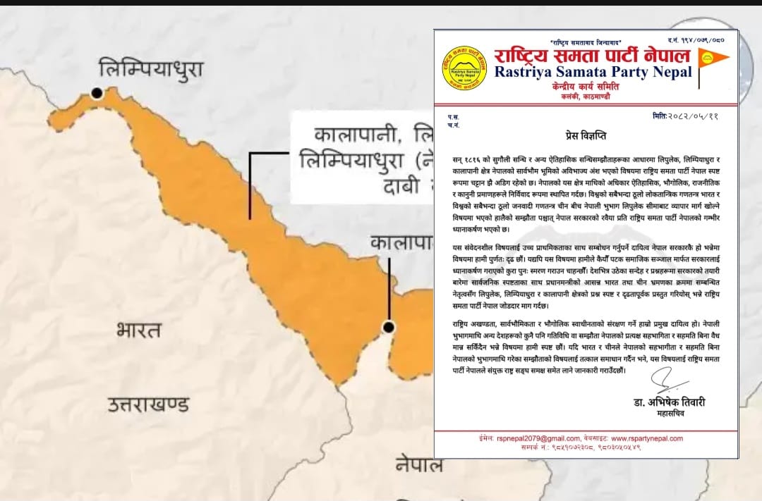 काठमाडौँ । राष्ट्रिय समता पार्टी नेपालले ऐतिहासिक सुगौली सन्धि (सन् १८१६) लगायत अन्य ऐतिहासिक प्रमाणका आधारमा लिपुलेक, लिम्पियाधुरा र