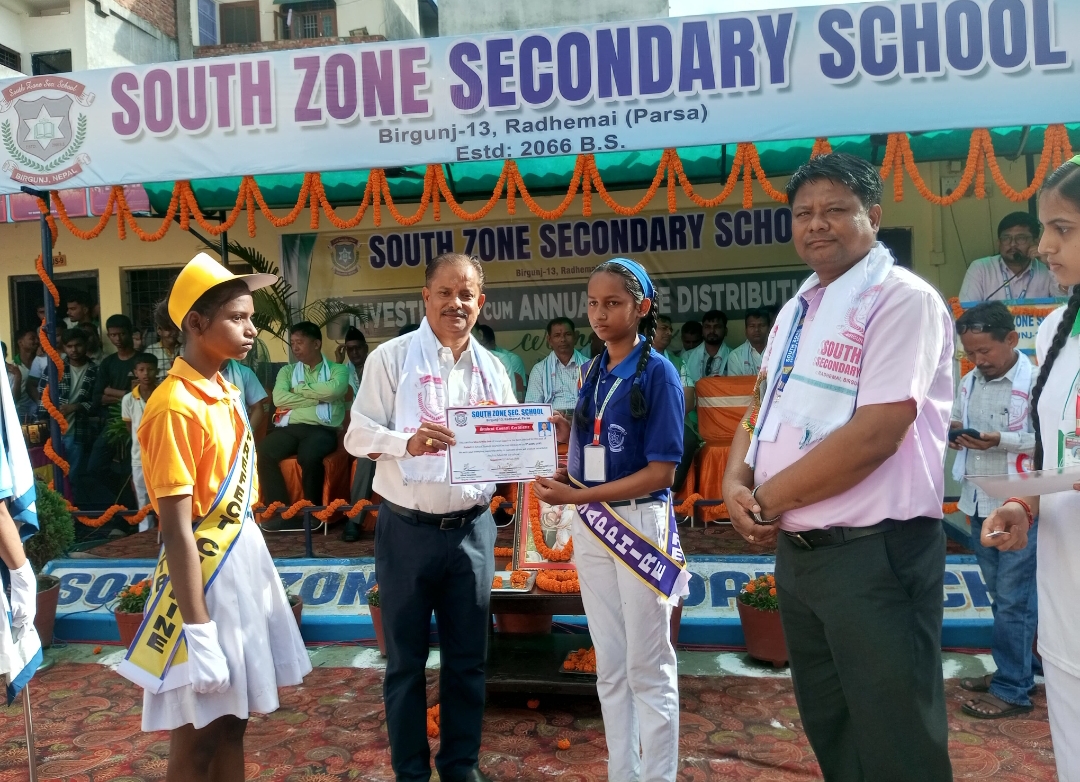 “A dwelling to craft all aptitude and morality” भन्ने नाराका साथ शिक्षादान गरिरहेको साउथ जोन सेकेन्डरी स्कूल, वीरगंजमा विद्यार्थी