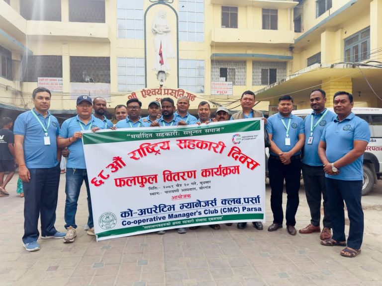 अभिलाष गुप्ता चैत २० बिरगंज ६८ औ सहकारी दिवसको अवसरमा कोअपरेटिभ म्यानेजर क्लब पर्साको आयोजनामा बिरगंज महानगरपालिका स्थित नारायणी क्षेत्रीय अस्पतालमा फलफुल वितरण कार्यक्रम सम्पन्न भएको छ। उक्त कार्यक्रममा क्लबका अध्यक्ष रविभूषण श्रीवास्तवको अध्यक्षतामा सम्पन्न भएको हो। उक्त